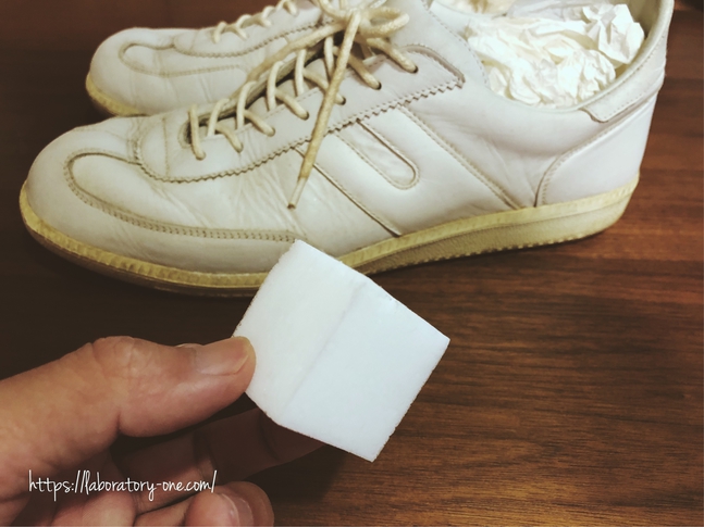 メラミンスポンジは、ホームセンターや100円ショップで手軽に手に入る掃除用具です。白いスニーカーの黄ばみにも非常に効果的です。