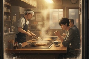 胃の奥にあるお好み焼きの熱と、鉄板の煙に巻かれた記憶が、体温を一段階上げている。